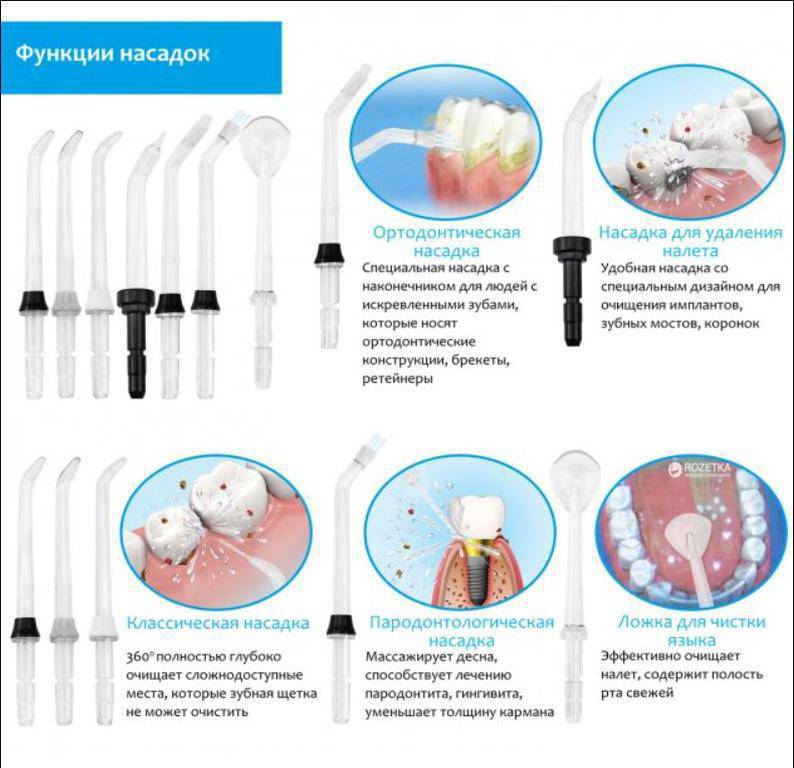 Ефективним є іригатор для зубів також для коронок, брекетів, імплантів, мостів. Він добре промиває ділянки під скобами та іншими конструкціями, не травмує поверхню зубів та ясен.