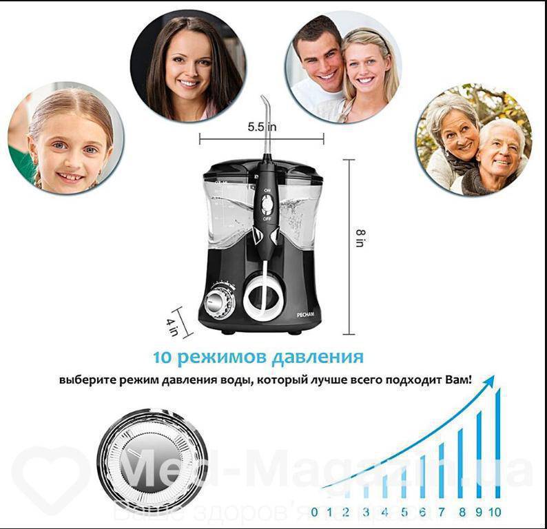 Іригатор PECHAM Professional Black Edition представлений у чорному кольорі, об'єм резервуару для води складає 600 мл. Прилад призначений для домашнього використання, підходить для всієї родини для гігієнічного очищення ротової порожнини: очищення зубів від нальоту, профілактики утворення зубного каменю, відбілювання та полірування поверхні, догляду за яснами та стоматологічними конструкціями.